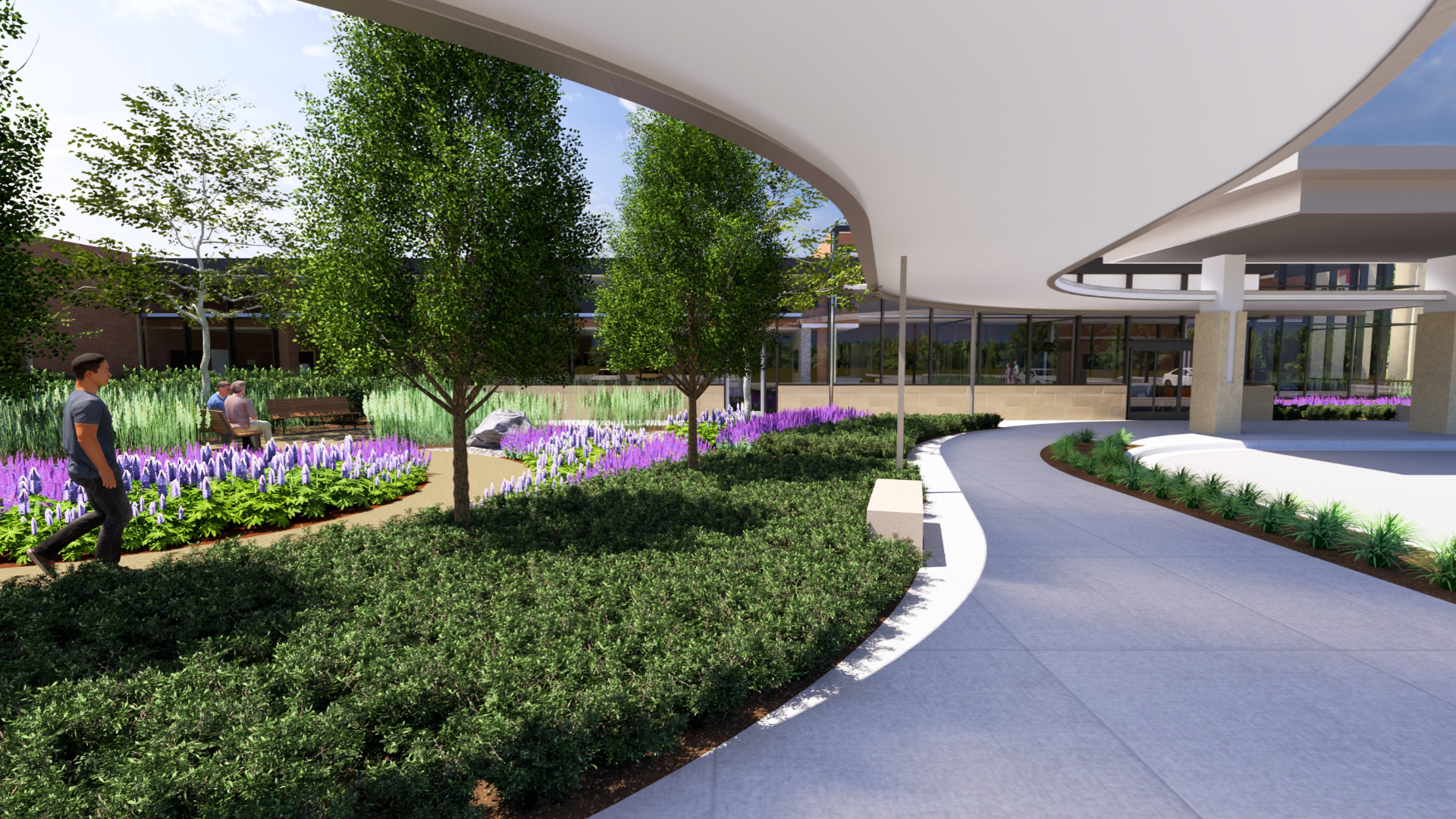 - Add a circular drop-off and canopy extending to the Cancer Center entrance.